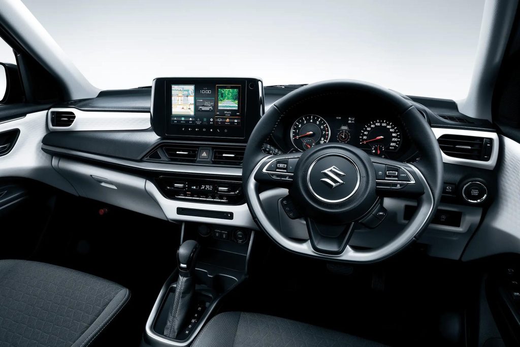 ภายในออกแบบคอนโซลหน้าคล้ายเพื่อนร่วมค่ายด้วยโทนสีขาวดำตั้งแต่มาตรวัดเรืองแสงพร้อมจอแสดงข้อมูล MID จอสัมผัสขนาดใหญ่แบบลอยตัวขนาด 9 นิ้ว เชื่อมต่อ Android Auto รูปแบบใหม่ Apple CarPlay พร้อมสั่งงานด้วยเสียงกับคำว่า ‘Hi Suzuki’ พวงมาลัยมัลติฟังก์ชันสามก้านทรงคุ้นตาแบบท้ายตัด เบาะนั่งสปอร์ต 5 ที่นั่งออกแบบใหม่ให้นั่งสบายมากขึ้นพร้อมเบาะนั่งหลังพับได้แบบ 60/40 หุ้มด้วยผ้าสีดำเข้มเดินด้านสวยงาม มี Suzuki Connect เชื่อมต่อข้อมูลตัวรถ สถานะการจอดรถระยะไกลระยะใกล้ผ่านทางสมาร์ตโฟน สบายขึ้นด้วยเบรกมือไฟฟ้า Electric parking brake (EPB) พร้อม Auto Hold