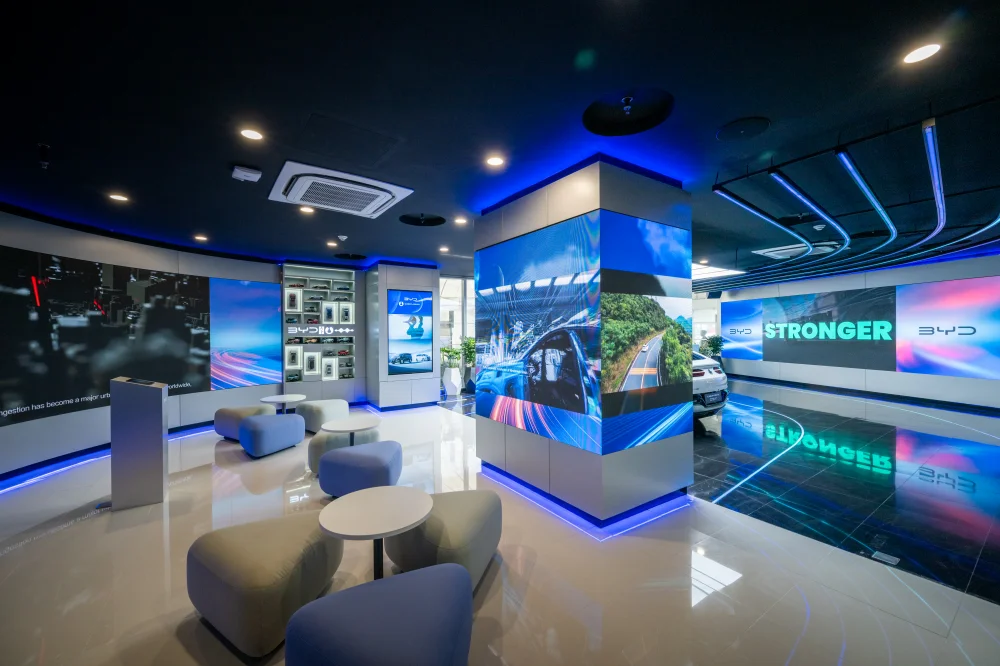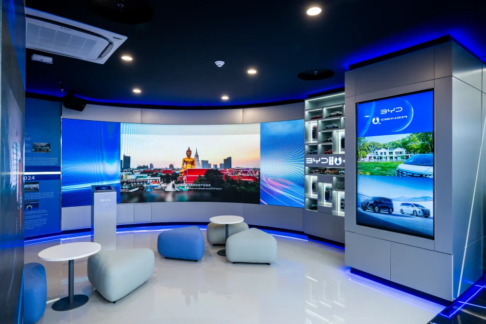 ทั้งยังมีบอร์ดและจอโค้ง LED ขนาดใหญ่ไว้บอกเล่าทุกเรื่องราวสำคัญ ตั้งแต่อดีตจนถึงปัจจุบันของ BYD และยังมีคลิปสัมภาษณ์แนวคิดของผู้บริหารเกี่ยวกับการดำเนินธุรกิจอีกด้วย