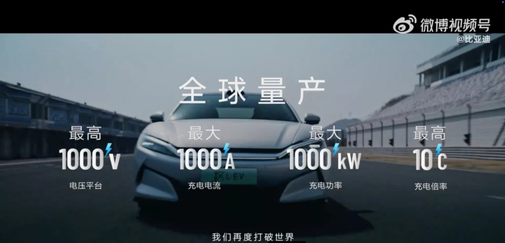 BYD เปิดตัวแพลตฟอร์มใหม่สำหรับรถยนต์ไฟฟ้าในชื่อ “Super E-Platform” ซึ่งมีจุดขายสำคัญคือการที่มันเป็นสถาปัตยกรรมการจ่ายไฟระดับ 1,000 โวลท์ ซึ่งทำให้รถรองรับความแรงในการชาร์จไฟสูงสุดถึง 1,000 kW จนทำให้รถสามารถชาร์จไฟสำหรับการวิ่งในระยะทาง 400 กิโลเมตร ภายในเวลาเพียง 5 นาที เท่านั้น ซึ่งเป็นตัวเลขที่ใกล้เคียงกับการเติมน้ำมันเชื้อเพลิงเพื่อเดินทางต่อของรถยนต์สันดาปภายในมากขึ้น