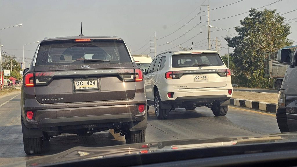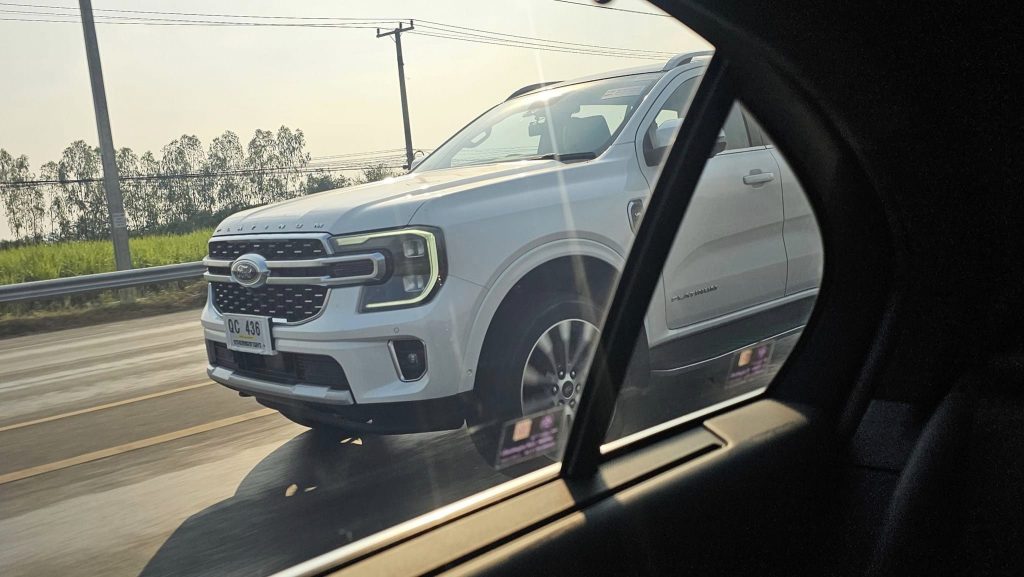 นั่นก็คือ Ford Everest Platinum V6 โดยคุณ Choedsak Lookin ได้เป็นคนถ่ายนี้กับมือกับรถสามคันติดป้าย QC แบบไม่พรางตัววิ่งบนถถน สายนครปฐม–สุพรรณบุรี ด้วยหน้าตาหรูหราตั้งแต่ไฟหน้า Matrix LED รูปตัว C ลายเส้นอันทรงพลังบนกระจังหน้า ชุดแต่งสีเดียวกับตัวรถทั้งกระจกมองข้าง และ ที่เปิดประตู กรอบกระจกโครเมียม ราวหลังคาสีเงินไฟท้าย LED ดีไซน์ใหม่ ส่วนล้ออัลลอยใหญ่สุด 21 นิ้ว