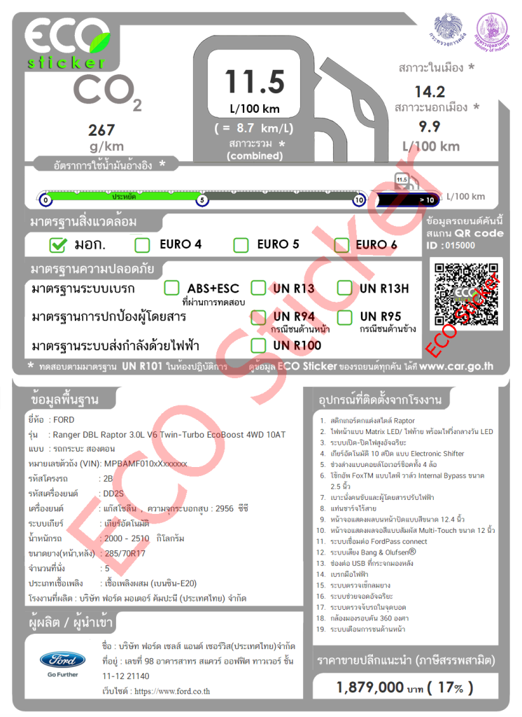 Ford Ranger Raptor 2022 ไทยคว้าอัตราประหยัดเฉลี่ยรวม 8.7 ก.ม./ลิตรจากอีโค่สติ๊กเกอร์เผยอาจซุ่มปรับราคาจำหน่ายเพิ่ม 10,000 บาทเร็วๆนี้