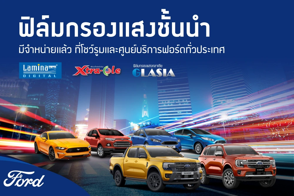 ฟอร์ด ประเทศไทย แนะนําบริการติดตั้งผลิตภัณฑ์ฟิล์มกรองแสงรถยนต์โดยศูนย์บริการฟอร์ด ซึ่งฟอร์ดได้คัดสรรฟิล์มกรองแสงรถยนต์ชั้นนำ 5 รุ่นจาก 3 แบรนด์ระดับโลก เพื่อเพิ่มทางเลือกให้ลูกค้าฟอร์ดได้ใช้ฟิล์มกรองแสงคุณภาพสูงมาตรฐานสากล พร้อมมอบความสบายใจด้วยประกันคุณภาพฟิล์มกรองแสงระยะเวลานานถึง 7 ปี