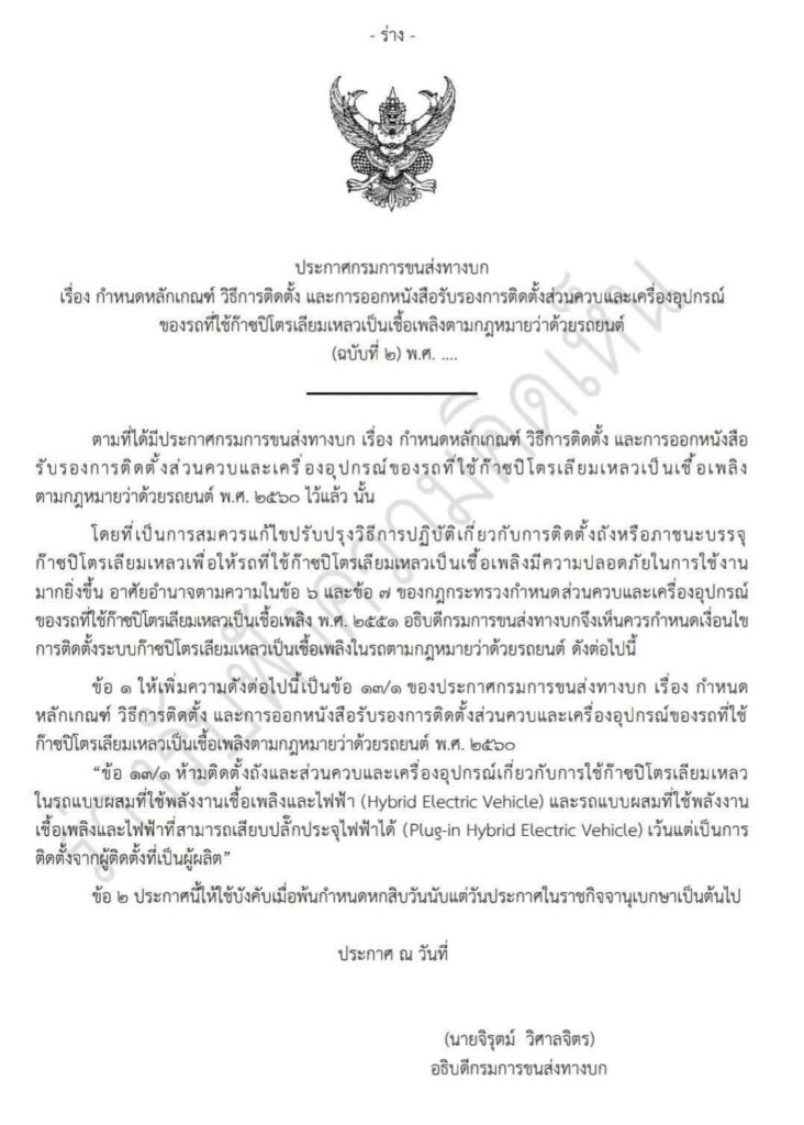 ล่าสุด ตามโลกอินเตอร์ กำลังตื่นตัว เมื่อ ดูเหมือนภาครัฐกำลังเร่ง ในการออกร่าง หลักเกณฑ์ การติดตั้ง และ การออกส่วนควบและเครื่องอุปกรณ์ของรถยนต์ที่ใช้กําซปิโตรเลียมเหลวเป็นเชื้อเพลิงตามกฏหมายว่าด้วยรถยนต์
