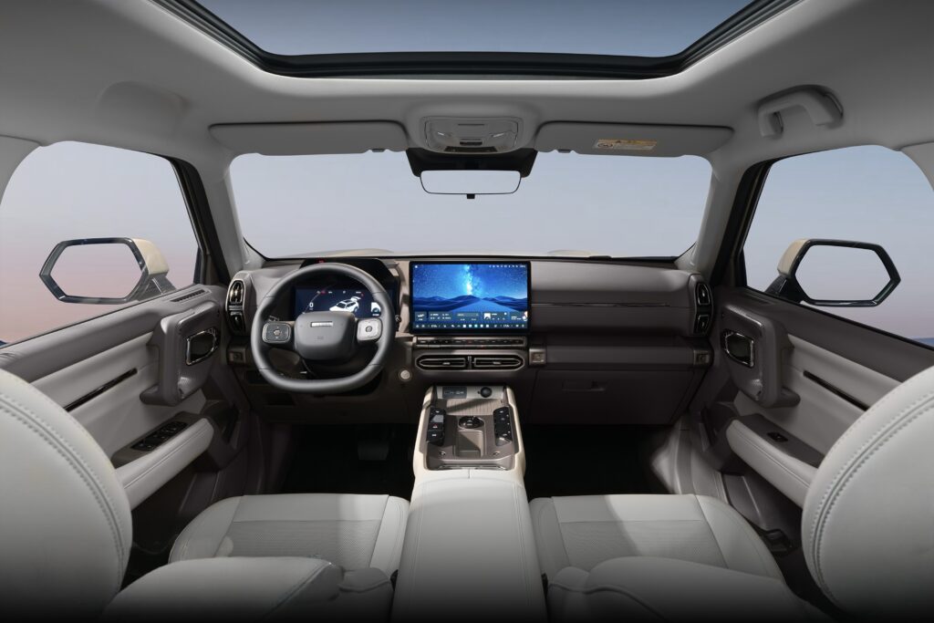 GWM HAVAL Big Dog Plus เจนที่ 2 มาพร้อมหน้าตาอันดุดัน โหด ดิบ ในสไตล์เอสยูวี เริ่มที่กระจังหน้าใหม่ทรงใหม่ต่างจากรุ่นสันดาปกับตรา HAVAL ขนาดใหญ่แถมเรืองแสง ไฟหน้า LED ทรงกลม พร้อมไฟ DRL LED ในโคมเดียวกันด้านข้างดุดันโค้งมนทั้งราวหลังคาสีเงินทรงกลมกลืนกับหลังคารถ หลังคาพาโนรามิกซันรูฟ