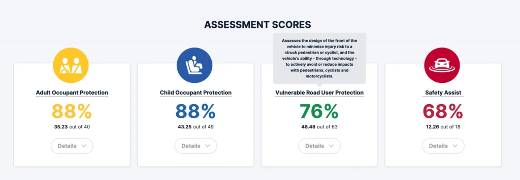 ตามประกาศ รถรุ่นนี้คะแนนเพียง 4 ดาวเท่านั้น หากเจาะลึกลงไปตามข้อมูลการทดสอบการชน ตามรายงาน จะพบว่า ตัวรถมีคะแนนการปกป้องผู้โดยสารเพียง 88% ผู้โดยสารเด็ก 88% การปกป้องคนเดินเท้า 76% และ คะแนนระบบความปลอดภัยขั้นสูง 68%