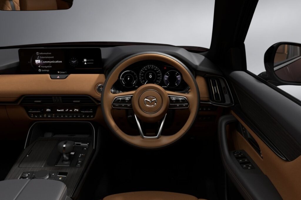 ภายในครบครันด้วยมาตรวัดดิจิทัล TFT-LCD 12.3 นิ้ว จอสัมผัสขนาดใหญ่ 12.3 นิ้ว พร้อมระบบ Mazda Connect infotainment รองรับ Apple Car Play ไร้สาย และ Android Auto ผ่านปุ่มควบคุมอัจฉริยะ Center Commander พร้อมลำโพง BOSE 12 จุด จอแสดงการขับขี่บนแผงคอนโซลหน้า Windshield Active Driving Display ขนาดใหญ่กว่าถึง 3 เท่า ตกแต่งมาแบบโทนสีน้ำตาลอ่อน สดใส ด้วยการติดตั้งวัสดุคุณภาพสูงไม่ว่าจะเป็นลายไม้เมเบิ้ลหรือ Mable Wood