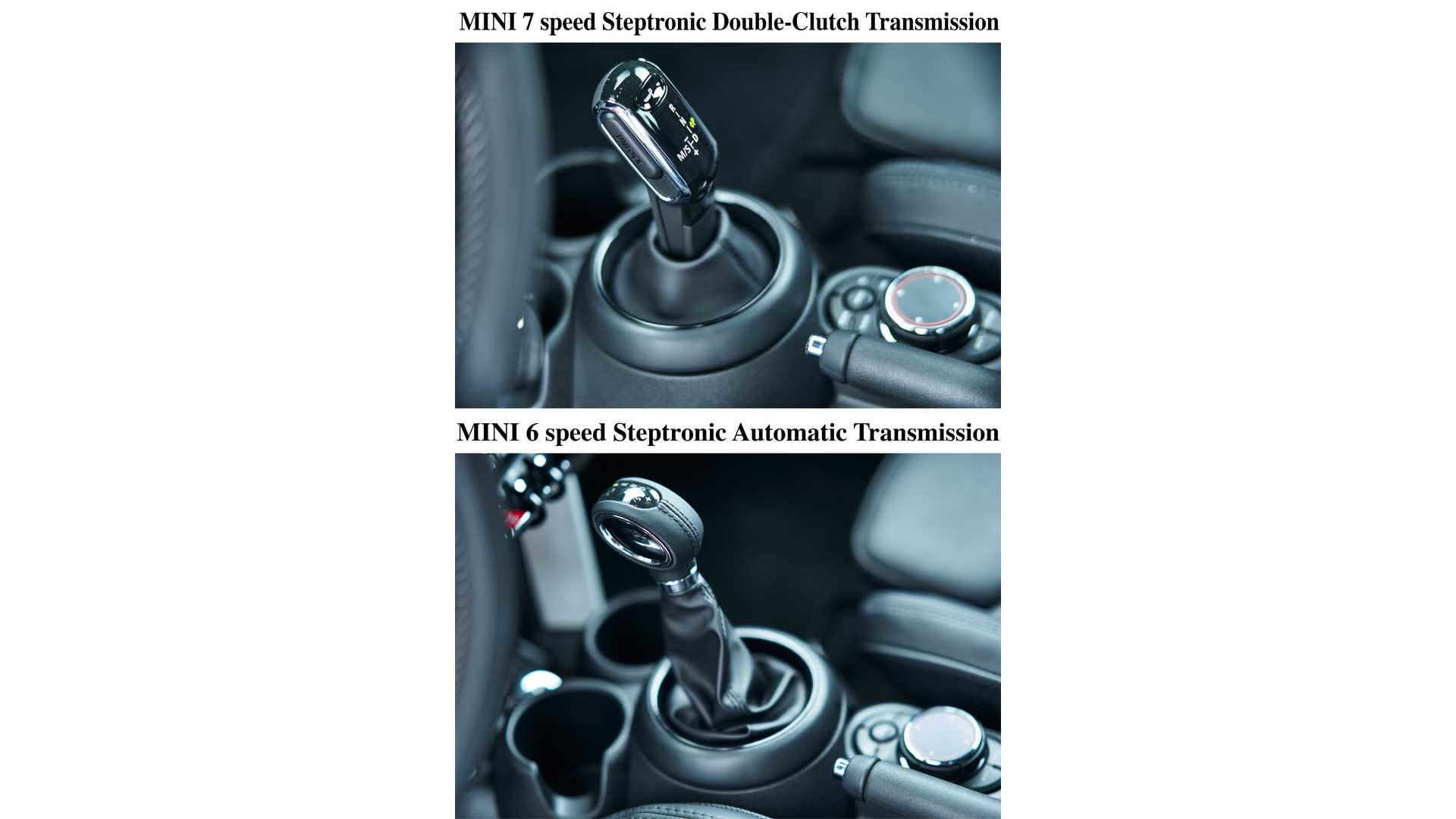 เกียร์อัตโนมัติแบบคลัทช์คู่ 7 สปีดของ MINI จะมีให้เป็นตัวเลือกแก่ลูกค้าที่จะซื้อรถรุ่น 3 ประตู 5 ประตู รวมถึงรุ่นเปิดประทุนสุดเท่ โดยทางทีมพัฒนากล่าวว่า “เกียร์รุ่นใหม่นี้จะมอบความประทับใจขณะขับขี่ต่อผู้อยู่หลังพวงมาลัยอย่างมาก อีกทั้งขนาดของชุดเกียร์ยังมีขนาดเหมาะสมด้วยการร่วมเกียร์สองส่วนเข้าไว้ด้วยกัน” นอกจากนี้การเปลี่ยนเกียร์ก็ทำเหมือนการใช้งานเกียร์ไฟฟ้าที่มีอยู่ในรถตระกูล BMW ไม่มีผิด