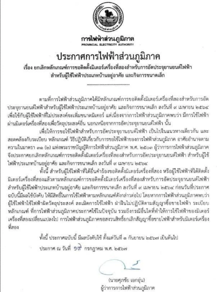 กฟภ. หรือ การไฟฟ้าส่วนภูมิภาค (PEA) ได้มีการออกประกาศใหม่เมื่อวันที่ 17 กรกฏาคม พ.ศ. 2567 ที่ผ่านมาว่า นับตั้งแต่วันที่ 1 สิงหาคม พ.ศ. 2567 ทางหน่วยงานจะ ปิด ไม่อนุญาต ให้ประชาชนสามารถทำการขอมิเตอร์ไฟฟ้าตัวที่สอง สำหรับคิดอัตราค่าไฟฟ้า TOU หรือ อัตราค่าไฟฟ้าตามช่วงเวลาของการใช้ (Time of Use Tariff : TOU Tariff) เพื่อใช้ในการชาร์จรถยนต์ไฟฟ้าได้อีกต่อไปแล้ว หลังจากที่ได้มีการประกาศใช้นโยบายนี้มาตั้งแต่วันที่ 9 เมษายน พ.ศ. 2564