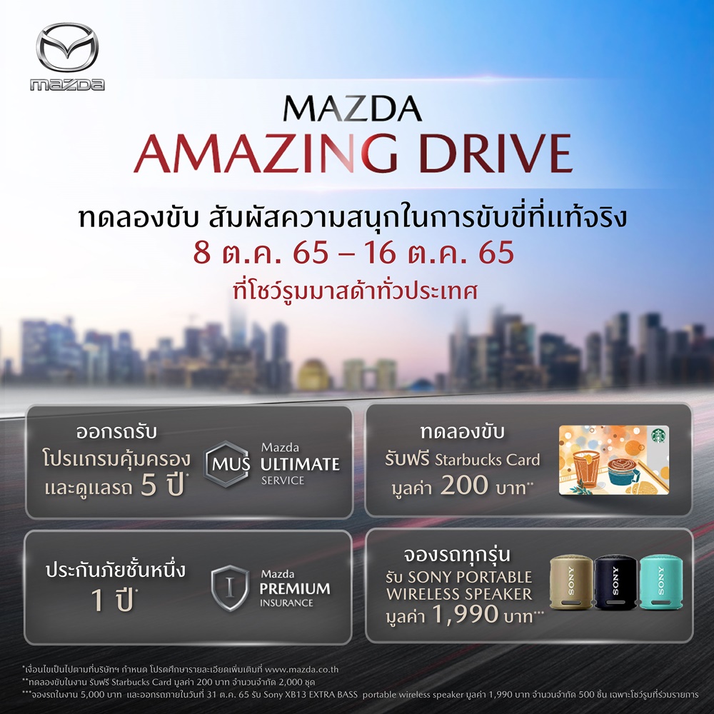 พร้อมกันนี้ในเดือนตุลาคม มาสด้ายังได้มอบข้อเสนอสุดพิเศษให้กับลูกค้าที่ต้องการออกรถใหม่ด้วยกิจกรรมสุดพิเศษ Mazda Amazing Drive ทดลองขับสัมผัสความสนุกในการขับขี่ที่แท้จริง ระหว่างวันที่ 8 – 16 ตุลาคม 2565 ที่โชว์รูมมาสด้าทั่วประเทศ ทดลองขับรถยนต์มาสด้าทุกรุ่น รับฟรี Starbucks Card มูลค่า 200 บาท* และเมื่อออกรถ รับฟรี Mazda Ultimate Service (MUS) หรือ โปรแกรมคุ้มครองและดูแลรถ 5 ปี* ฟรีประกันภัยชั้นหนึ่ง Mazda Premium Insurance (MPI) 1 ปี* และลำโพง Sony Portable Wireless Speaker มูลค่า 1,990 บาท* นอกจากนี้ มาสด้ายังเปิดโอกาสให้ลูกค้าได้เป็นเจ้าของรถยนต์มือสองคัดคุณภาพ ในงาน Mazda Certified Pre-Owned Day พบกับข้อเสนอ ออกรถ 0 บาท** ขับฟรี 90 วัน** รับประกันภัยชั้นหนึ่ง 1 ปี** รับประกันคุณภาพสูงสุด 1 ปี** และจองมาสด้าทุกรุ่นรับ JBL Flip Essential มูลค่า 1,990 บาท** ระหว่างวันที่ 1-31 ต.ค. 65 ที่ผู้จำหน่าย Mazda CPO ทั่วประเทศ