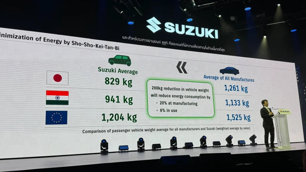 ในกรณีนี้ ทางซูซูกิ ยกตัวอย่าง ขนาดรถที่พวกเขาวางจำหน่ายอยู่ภายใต้โครงสร้างตัวถัง Heartec อย่างรถที่ผลิตในญี่ปุ่น จะมีน้ำหนักเฉลี่ย 829 กิโลกรัม น้อยกว่าแบรนด์อื่นๆ ที่จะอยู่ในระดับ 1,261 กิโลกรัม อัตราส่วนเดียวกันนี้ ถูกใช้ในรถที่วางจำหน่ายในประเทศอื่นๆ