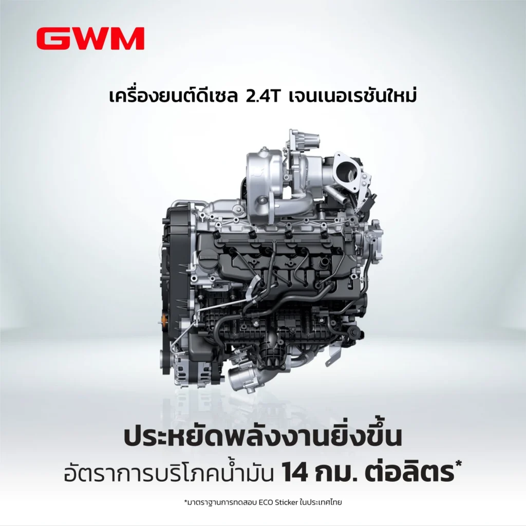 ไมเคิล ฉง กรรมการผู้จัดการ GWM (Thailand) กล่าวว่า “GWM มุ่งมั่นส่งมอบเทคโนโลยีใหม่และนวัตกรรมล้ำหน้า เพื่อสร้างประสบการณ์การใช้งานที่ดียิ่งกว่า เหนือกว่า และครอบคลุมทุกความต้องการที่มากกว่าเพื่อผู้ใช้งานชาวไทยทุกคน ผ่านแนวคิด GWM Go With More ที่สะท้อนถึงพันธกิจของ GWM ในการส่งมอบผลิตภัณฑ์และบริการที่ดีกว่าและเหนือกว่าในทุกมิติของการใช้รถยนต์ที่ครอบคลุมทุกประเภทพลังงาน สำหรับเครื่องยนต์ดีเซล 2.4T เจนเนอเรชันใหม่นี้ เป็นเทคโนโลยีเครื่องยนต์ดีเซลที่เป็นความเชี่ยวชาญของ GWM โดยมีการวิจัยและพัฒนามาอย่างต่อเนื่องและยาวนาน จนประสบความสำเร็จและได้รับการยอมรับจากผู้ใช้ทั่วโลก