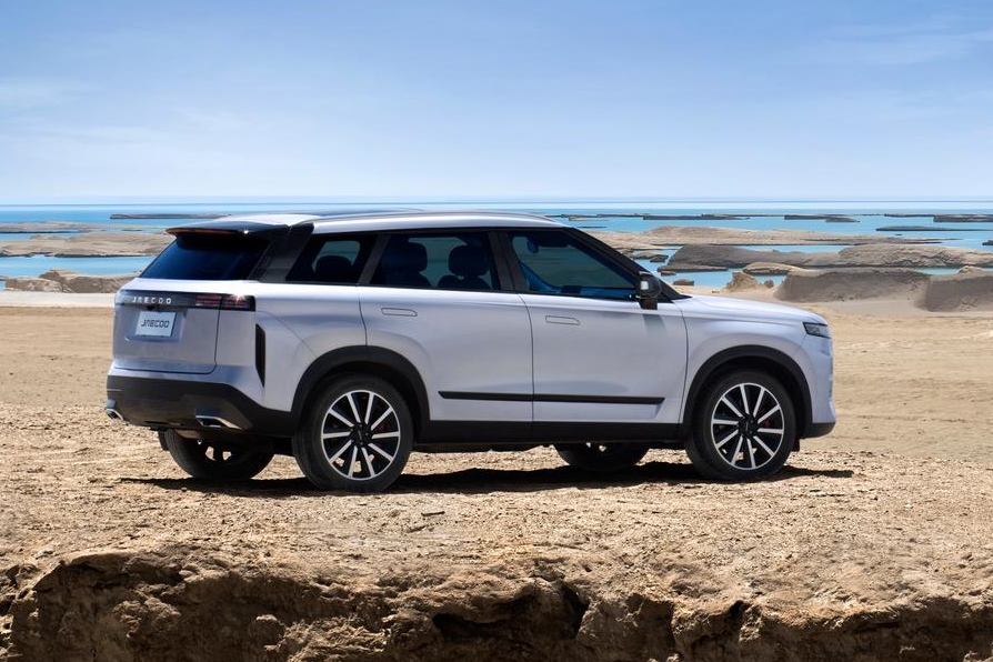 ด้านข้างมาพร้อมที่เปิดประตูดีไซน์เรียบเนียนกับตัวถังรถ หลังคารถออกแบบอย่างเฉียบขาดพร้อมราวหลังคาด้านท้ายเด่นสง่าด้วยไฟท้าย LED แนวยาวประดับด้วยตัวอักษร JAECOO ประกบด้วยกันชนหลังทรงหรูด้วยตัวรถที่ใหญ่กว่าเพื่อนๆ ล้ออัลลอยขนาด 18 นิ้วและขนาด 19 นิ้ว ให้เลือกตรงตามความต้องการ ตัวรถนำพื้นฐานของ CHERY Explore 06 เปลี่ยนหน้าตาให้สมกับความเป็น JAECOO ด้วยแพลตฟอร์ม T1X