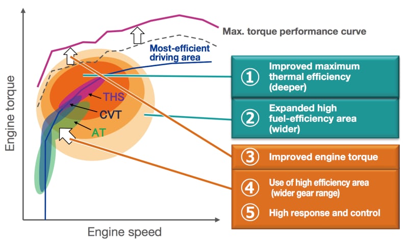 ตลอดจนเครื่องยนต์รุ่นใหม่ ยังมีการเพิ่มกำลังอัดจากปัจจุบันไปเป็น 13.0 :1 และ เพิ่มเป็น 14.0:1 เมื่อทำงานภายใต้เงื่อนไขแบบระบบไฮบริด มันมาพร้อมระบบคอยย์จุดระเบิดกำลังสูง และ หัวฉีดน้ำมันหลายรู ทั้งหมดให้ประสิทธิภาพในการขับขี่และลดการปล่อยไอเสียดีกว่าเดิม