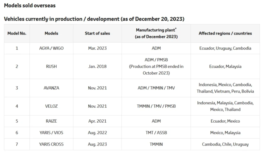 อย่างไรก็ดี แม้จากตารางข้อมูลรถที่ได้รับตรวจสอบว่ามีความผิดปกติจากการปลอมแปลงเอกสาร จะมีการระบุถึงตัวรถ Toyota Yaris/Vios ซึ่งหมายถึง Toyota Yaris Ativ ที่ผลิตขึ้นในโรงงานของ Toyota Motor Thailand (TMT) ด้วย แต่ทาง Toyota บริษัทแม่ก็ระบุว่ารถที่จะได้รับผลกระทบจากการตรวจสอบในครั้งนี้ จะมีเฉพาะตัวรถที่ส่งออกไปวางจำหน่ายในประเทศเม็กซิโก และมาเลเซีย เท่านั้น ไม่ได้กระทบถึงตัวรถที่ถูกผลิตไว้วางจำหน่ายในประเทศไทย