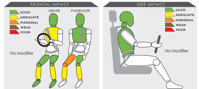 ภาพแสดงผลการทดสอบการชน – และ บริเวณที่ผู้โดยสารผู้ใหญ่อาจจะบาดเจ็บเมื่อเกิดการชน