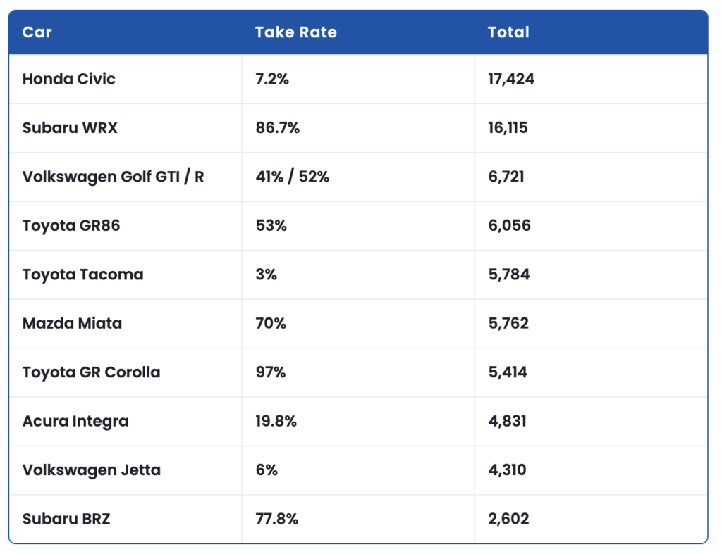 ครองโดย Honda Civic มียอดขายถึง 17,424 คัน หรือ ถ้าเทียบกับ ยอดรวม ของซีวิค ที่ขายในอเมริกา มียอดขาย 242,005 คัน เกียร์ธรรมดา มีสัดส่วน ราวๆ 7.2 % ของยอดขาย