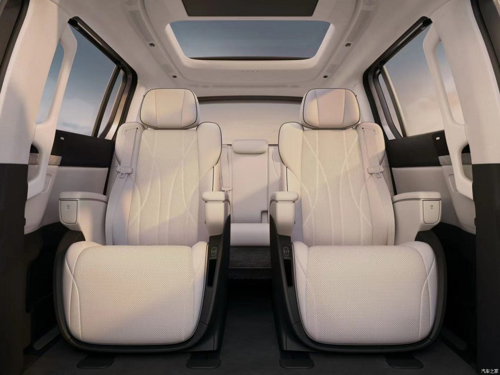 ภายในเห็นห้องโดยสารหรูหราพร้อมแผงหน้าปัดดิจิทัลแบบ LCD ระบบอินโฟเทนเมนต์แบบลอยตัวขนาด 17.3 นิ้ว และลายไม้ที่ล้อมรอบดูหรูหรา เชื่อมต่อด้วยที่ชาร์จสมาร์ทโฟนไร้สาย 2 ตำแหน่ง ประมวลผลเร็วด้วย Qualcomm Snapdragon SA8295P และลำโพงรอบคัน 23 จุดกำลังขับ 2,180 W พร้อมเส้นสายตกแต่งด้วยสีเงิน ไฮไลท์ที่สุดก็คือภายในสบายแบบ 7 ที่นั่ง เบาะนั่งแถวที่ 2 ที่สามารถปรับเอนได้ทั้งพนักพิงและที่พักเท้าผ่อนคลายขณะชมรายการบันเทิงบนจอทีวีติดเพดานขนาดใหญ่ 21.4 นิ้ว มี “ตู้เย็น” ในตัวพร้อมระบบฟอกอากาศที่ทำให้หายใจได้อย่างสะดวก เครื่องปรับอากาศ เบาะนั่งแถวที่ 2 ยังติดตั้งบนแถบเลื่อนไฟฟ้า ในขณะที่แถวที่ 3 พับราบเพื่อให้เห็นพื้นที่เก็บสัมภาระได้มากถึง 2,554 ลิตร และหลังคาพาโนรามิกซันรูฟคู่