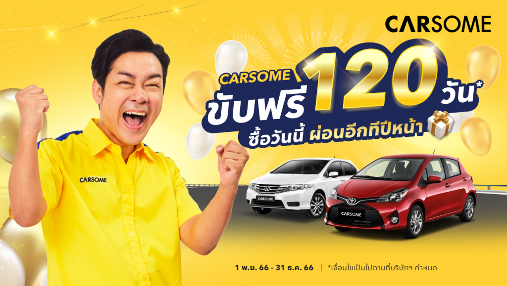 ความพิเศษตอนนี้คือ CARSOME กำลังจัดหนักให้กับลูกค้าที่สนใจซื้อรถมือสองส่งท้ายปี ด้วยแคมเปญ​ “CARSOME เลี้ยงส่งท้ายปี ขับฟรี 120 วัน” ให้คุณได้ถอยรถที่ชอบ ในที่ใช่ ในราคาผ่อนเริ่มต้นเพียง 4,XXX บาทต่อเดือน พร้อมดอกเบี้ยสุดพิเศษเริ่มต้นเพียง 2.99% รวมถึงตัวเลือกข้อเสนอสำหรับคนที่อยากออกรถช่วงท้ายปีไม่ว่าจะเป็น