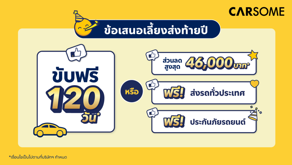 ดูรายละเอียดเพิ่มเติมได้ที่ CARSOME เลี้ยงส่งท้ายปี ขับฟรี 120 วัน