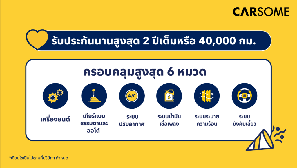 ไม่เพียงเท่านี้ ยังมีการรับประกันนานสูงสุด 2 ปีเต็มหรือ 40,000 กม.* ให้ความคุ้มครองครอบคลุมสูงสุดใน 6 หมวดสำคัญ ได้แก่