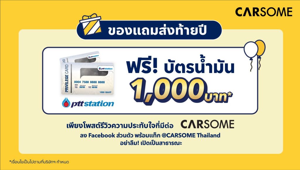 เพียงถ่ายรูปคู่กับรถของคุณพร้อมกับโพสต์รีวิวความประทับใจและลงรูปคู่ของคุณกับรถลง Facebook ส่วนตัว จากนั้น เปิดสถานะโพสต์เป็นสาธารณะและแท็ก @CARSOME Thailand เพียงเท่านี้ก็รับไปได้เลย! บัตรน้ำมัน PTT Station มูลค่า 1,000 บาท (สงวนสิทธิ์ให้ลูกค้าที่โพสต์รีวิวภายในวันสุดท้ายของเดือนที่รับรถเท่านั้น)
