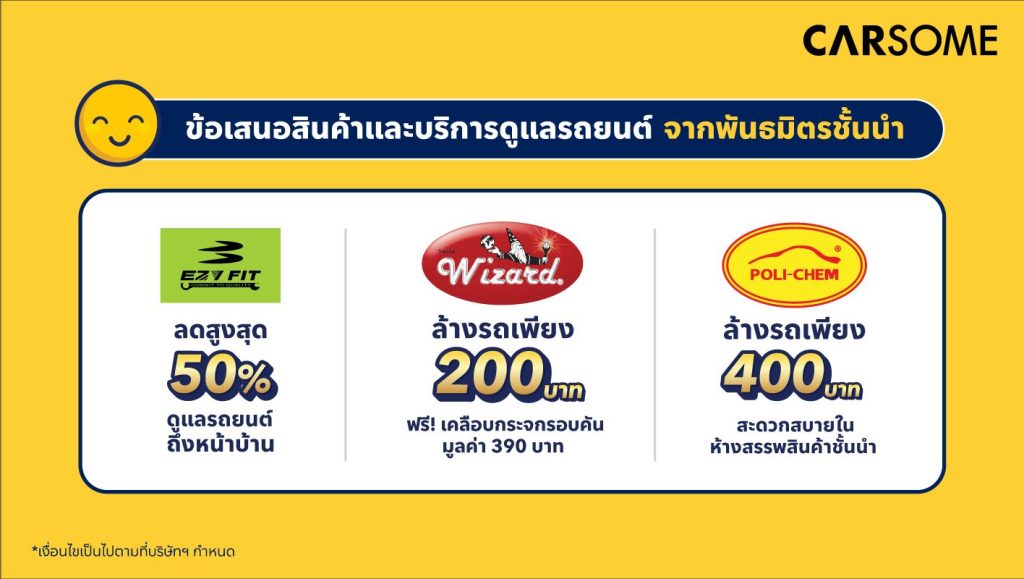 นอกจากนั้น ยังมีโอกาสรับข้อเสนอสินค้าและบริการดูแลรถยนต์จากพาร์ทเนอร์ของ CARSOME เหล่านี้ด้วย