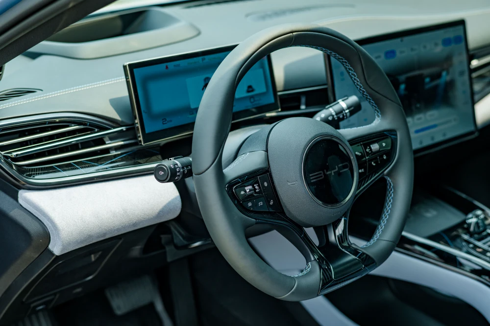 ส่วนงานตกแต่งภายในที่ดูแปลกตากว่ารถยนต์หลายๆคันที่ชาวไทยรู้จัก ตามฉบับของ BYD ด้วยแผงคอนโซลที่ใช้เส้นสายแบบมัดกล้ามเกือบจะคล้ายกับ Atto 3 แต่ใช้ช่องแอร์แบบกรอบกลม ซึ่งดูไปดูมาแอบคล้ายกับของรถจากแบรนด์หรูสัญชาติยุโรป และไม่ลืมที่จะใส่ชุดหน้าจอระบบอินโฟเทนนเมนท์ตรงกลางขนาด 12.8 นิ้ว ที่สามารถปรับแนวการแสดงผลได้ ว่าจะให้อยู่ในแนวตั้งหรือแนวนอน รวมถึงชุดหน้าจอแสดงผลข้อมูลตัวรถแบบลอยตัวอยู่บนคอพวงมาลัย
