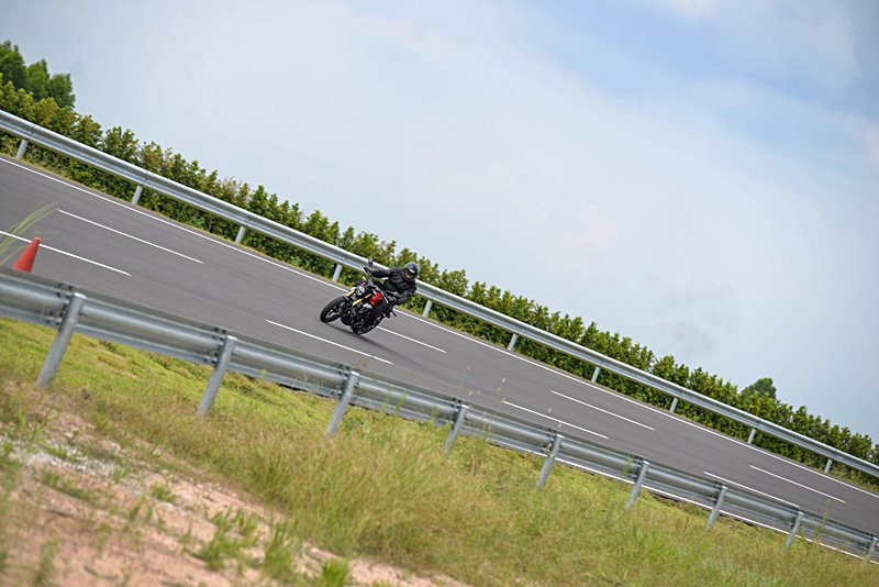 ระหว่างที่ขี่ในสนามรูปไข่ด้วยความเร็ว Honda CB150R โชว์ความดีงาม นอกเหนือจากการทำความเร็ว ด้วยความมั่นใจในการขับขี่ ช่วงล่างด้านหน้าที่ติดตั้งโช๊คอัพหัวกลับ ให้ความมั่นใจมาก ในยามใช้ความเร็วสูง รถนิ่งมั่นคงอุ่นใจยามใช้ความเร็ว แม้ว่าตัวมันจะมีน้ำหนักเบาหวิวก็ตามที