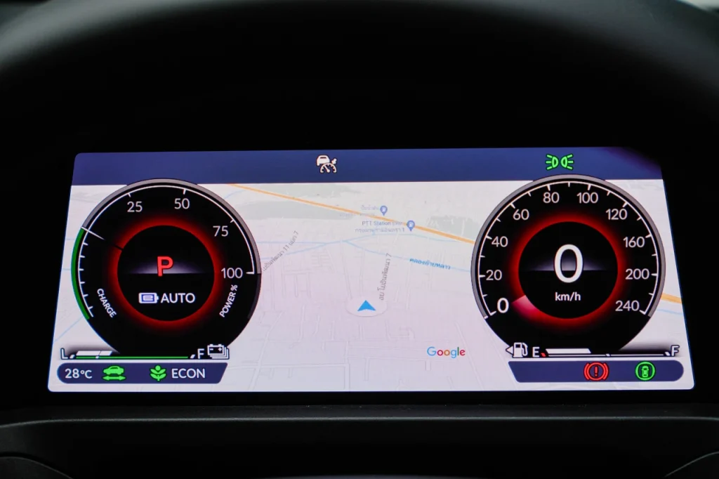 ด้วยความเป็นรถคลาสสูงกว่า ทางผู้พัฒนาไม่พลาดจะเปลี่ยนจากจอไมล์เข็มยอดนิยมในอดีต มาเป็นไมล์จอตามยุคสมัย หน้าคนขับขนาด 10.2 นิ้ว ใหญ่พอๆ กับรถยนต์ไฟฟ้าบางรุ่นในตลาด แสดงผลชัดเจน ตรงกลางเป็นจอแสดงข้อมูล ที่ยังสามารถปรับให้เป็นการแสดงแผนที่นำทางมองตรงนี้ก็ได้ จะได้ไม่ต้องหันหน้าไปมองจอกลาง