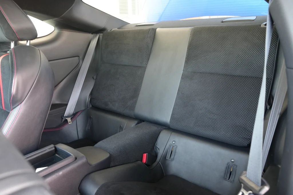 ส่วนด้านหลัง เบาะนั่ง สำรองสำหรับผู้โดยสาร ออกแบบไม่มีหัวหมอน ตามสไตล์รถสปอร์ต มันสามารถปรับพับได้ และยังสามารถติดตั้งเบาะนั่งเด็กได้ด้วย ผ่านระบบ Isofix แอบมีความเป็นรถครอบครัว สำหรับพ่อ-แม่ ที่ยังมีใจวัยรุ่น